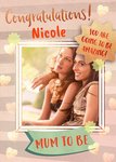 Front of card: Illustration of hearts and stars with photo upload and text on a orange glitter striped background. Text reads: "Congratulations Nicole You are going to be amazing! Mum to be". Editable name.