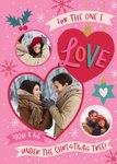 Featuring 2 circular photo frames & 1 heart photo frame with a red love heart bauble containing the word "love" in colourful typography with a pink banner above containing the words "For the one I", and another 2 that sit at the bottom of the card containing the words "you & me" & "under the Christmas tree!" surrounded by illustrations of holly, snowflakes, a star bauble all on a pink snowy effect background.