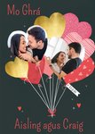 Front of card: Card Features an illustration of a bouquet of heart shaped balloons within two of the balloons are photo uploads. The editable text at the top and bottom of the card reads: "Mo Ghrá Aisling agus Craig."