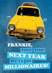 Front of card: Only Fools And Horses Funny Millionaires Birthday Card Features photo of yellow robin reliant on blue diamond pattern background. Text reads:"Frankie, This Time Next Year We'll Be Millionaires!". Frankie is customisable.