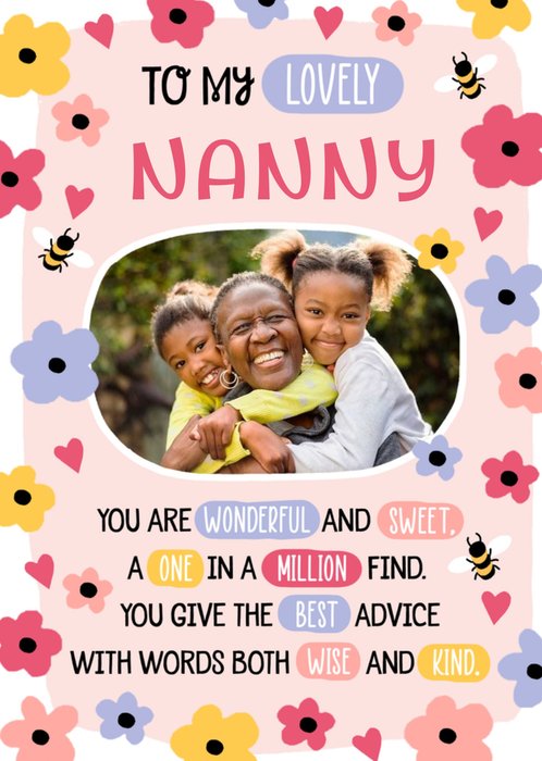 Front of card: Mother's Day Photo Upload Card Oval photo frame surrounded by colourful flowers. Text reads: "To my lovely Nanny you are wonderful and sweet. A one in a million find. You give the best advice with words wise and kind.". 'Nanny' can be personalised!