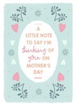 Front of card: Mother's Day Card Oval shape on a heart and foliage pattern background. Text reads: "A little note to say I'm thinking of you on Mother's Day".