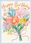 Featuring a painting of a cheerful bouquet of flowers, featuring summer flowers. The bunch is tied with a ribbon.