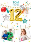 Front of card: 12th Photo Upload Birthday Card Party themed display of balloons with two photos surrounded by colourful confetti. Text reads: "Tom you're 12". 'Tom' can be personalised!