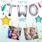 Front of card: 2nd Photo Upload Birthday Card Party themed display of Letter and star balloons with two photos surrounded by colourful confetti. Text reads: "You're two Harry". 'Harry' can be personalised!