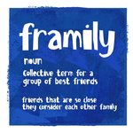 Front of card: Navy Illustration with abstract white text in the centre Non-editable text reads: "Framily. Noun. Collective term for a group of best friends. Friends that are so close they consider each other family."