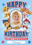 Featuring PAW Patrol puppies Marshall, Rubble, Chase, Skye & Everest surrounding an oval central photo area on a light blue greeting card, with bold colourful lettering and small paw prints decorating the design.