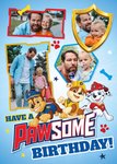 Featuring four colourful photo frames with images of Chase, Rubble and Marshall, playful icons & bold typography below, all on a light blue & white background.