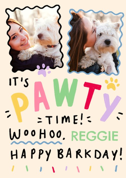 "It's pawty time! Woohoo, Reggie, happy Barkday". 'Reggie' can be personalised!