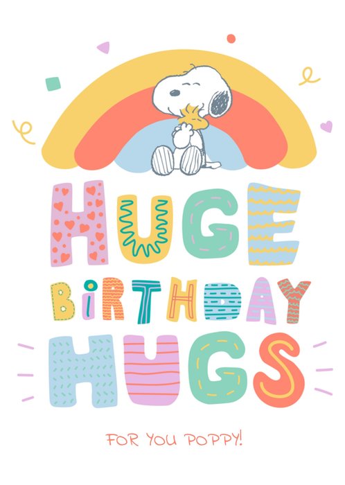 Front of card: Peanuts Huge Birthday Personalised Birthday Card White Background Colourful Rainbow Text And Peanuts illustration. Text reads: "Huge Birthday Hugs For You Personalised Name"