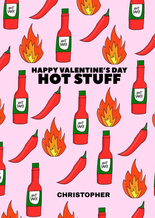 Front of Card: Illustration of multiple drawn chillies and Tabasco sauce bottles on a pink background.