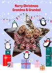 Front of card: Featuring a festive illustration of penguins and presents surrounding a star shaped photo frame. Text reads: "Merry Christmas