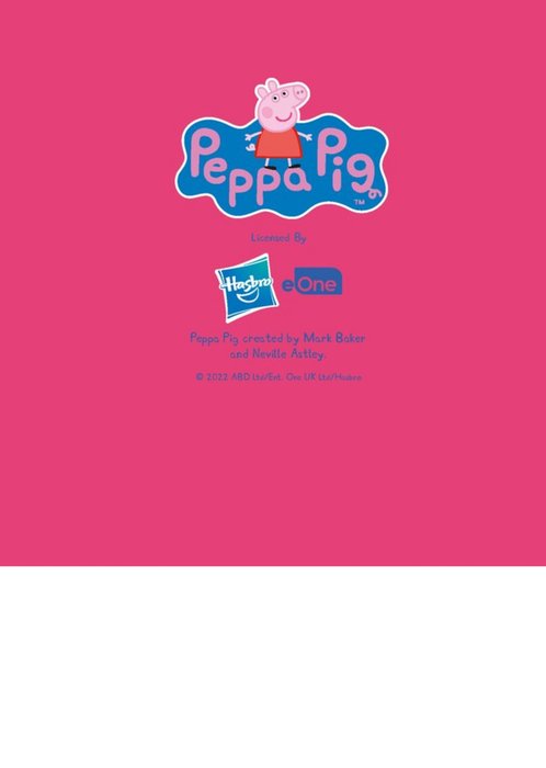 Front of card: Peppa Pig 2nd Birthday Card Illustration of Peppa Pig with fun and colourful typography. Text reads: "Happy 2nd birthday have a wonderfully magical day, Aaliyah". 'Aaliyah' can be personalised!