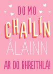 Front of Card: Personalised typographic card on a pink background, with white and pink and surrounded by small white hearts. The card reads in Gaelic:"Do Mo Chailín" "Álainn" "Ar Do Bhreithlá" Recipient can be personalised. The card has 1 large circular frame for a photo upload