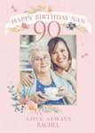 Front of card: Nan's 90th Photo Upload Birthday Card Photo frame surrounded by flowers on a pink background. Text reads: "Happy birthday Nan 90 love always Rachel". 'Rachel' can be personalised!