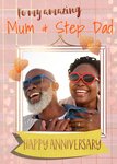 Front of card: Photo Upload Anniversary Card Photo frame surrounded by hearts. Text reads: "To my amazing Mum & Step Dad happy anniversary". 'Mum & Step Dad' can be personalised!