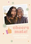 Front of card: 'Cheers mate!' Photo Upload Thank You Card Photo frame with a thumbs up emoji on a cream background. Text reads: "Cheers mate! Thank you for everything". 'Thank you for everything' can be personalised!