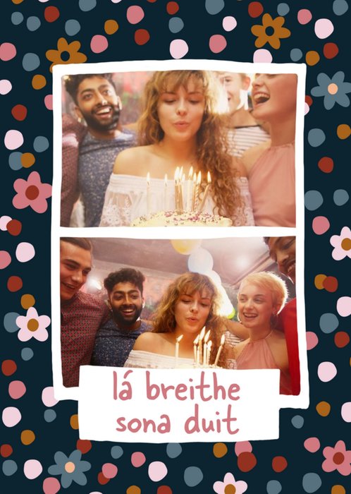 Front of card: 'Lá Breithe Shona Duit' Photo Upload Birthday Card Photo frames surrounded with a colourful floral pattern. Text reads: "Lá Breithe Shona Duit".