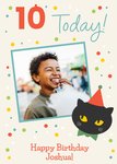 Front of card: Featuring an illustration of a cat and colourful polka dots with a photo frame on a cream background. Text reads: "10 today! Happy birthday