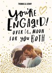 Front of card: Photo upload area at bottom of the card with large black handwritten text at top with editable names on a cream and gold coloured spotty patterned background Text reads:"Thomas and Jenny. You’re engaged! Over the moon for you both." With customisable names.
