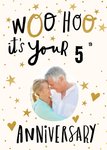 Front of card: Photo upload area surrounded by gold hearts, stars and polka dots on a cream background. Black and gold handwritten typography containing lovely anniversary message with editable anniversary year. Text reads:"Woo hoo it's your 5th anniversary" With customisable 5th.