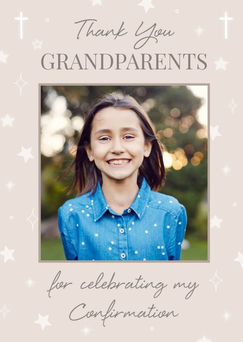 The card reads: "Thank you grandparents, for celebrating my confirmation".