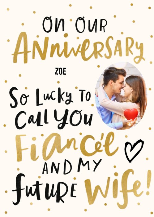 Front of card: Photo upload area surrounded by gold polka dots on a cream background. Black and gold handwritten typography containing lovely anniversary message with editable name. Text reads:"On our anniversary Zoe. So lucky to call you Fiancée and my future wife!" With customisable 5th.