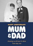 Front of card: Large photo upload area in top half of card with large white mum & dad type below and orange anniversary message above and below all on a navy background. Text reads:"Happy anniversary Mum and Dad. Showing us all how it’s done from day one." Back of card: Pigment logo. Moonpig logo.
