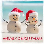 A photographic image of two Snowmen made out of sand on a sandy beach wearing Santa hats and smiling, Below this is editable text