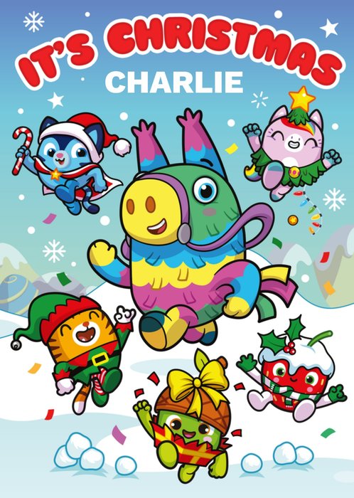 This greeting card design features a colourful and playful illustration of various Pinata Smashlings characters celebrating Christmas against a snowy backdrop, with the text “It’s Christmas”, with an editable name, prominently displayed at the top.