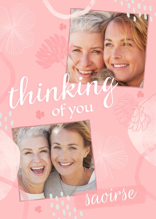 Simple floral illustrated pattern on a pink background with 2 photo upload frames and white text
