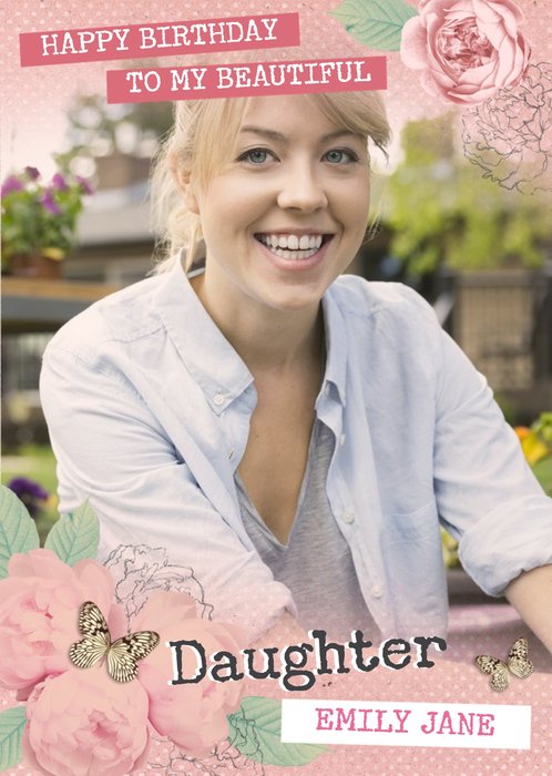 Pink Roses With Butterflies Personalised Photo Upload Happy Birthday Card For Daughter