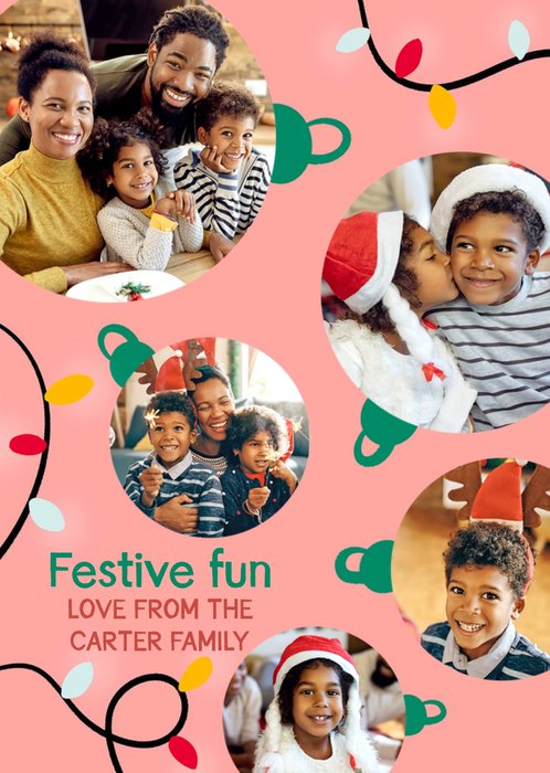 Front of card: A fun and colourful Christmas card featuring an Illustrated baubles and Christmas fairy lights intertwining throughout. There are five photo upload areas making up the main circular shape of the baubles.