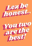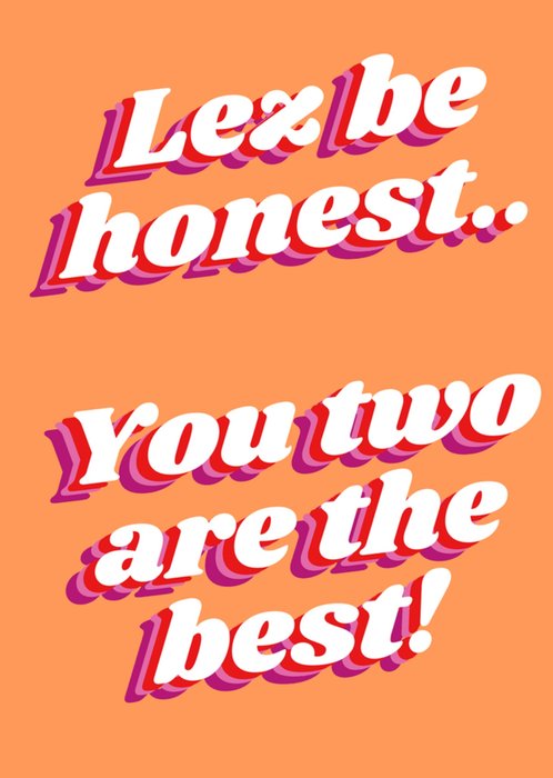 A cheeky and fun LGBTQ+ card featuring bold retro typography on a bright orange background. The playful pun “Lez be honest...” is a witty nod to lesbian pride, followed by a heartfelt compliment for a beloved couple. Perfect for celebrating love, friendship, or Pride with humour and affection.