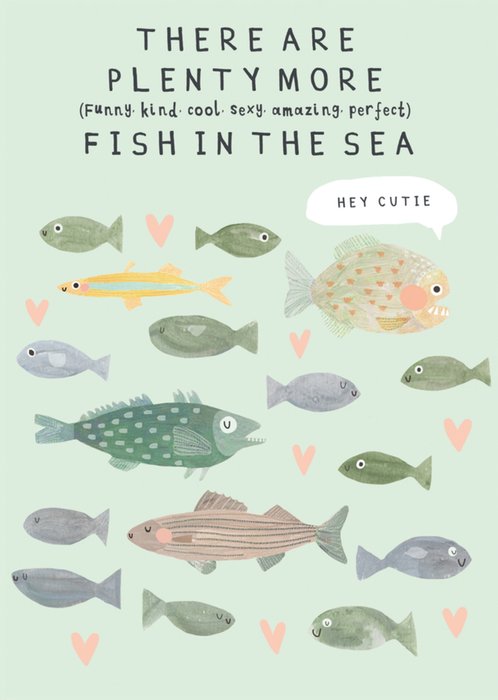 Featuring illustrations of various fish swimming among love hearts and one with a speech bubble containing the words "Hey cutie" with black typography at the top of the card, all on a green background.
