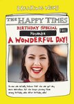 The card reads: "Breaking news, the happy times, Birthday special, Alexandra. A wonderful day!" and "Alexandra and No-one can actually believe that she can get any more..." are editable.