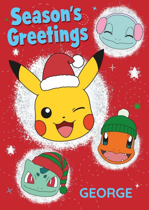 Pokemon Pikachu, Charmander, Bulbasaur, Squirtle wearing woolley christmas hats. Personalised name. Text reads: "Season's Greetings George"
