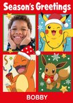 Front of card: Pokemon Characters Season's Greetings Photo Upload Card Pokemon Pikachu wearing a Santa hat and Christmas Lights, Charmander Wearing a Santa Hat and Plying with a Party Popper and Eevee smiling with a bow around it's neck in a grid picture format. Personalised name and Photo Upload. Text reads: "Season's Greetings Bobby"