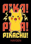 A bold greeting card with Pikachu jumping in excitement in front of huge red and yellow comic-style lettering, surrounded by lightning bolts on a deep black background.