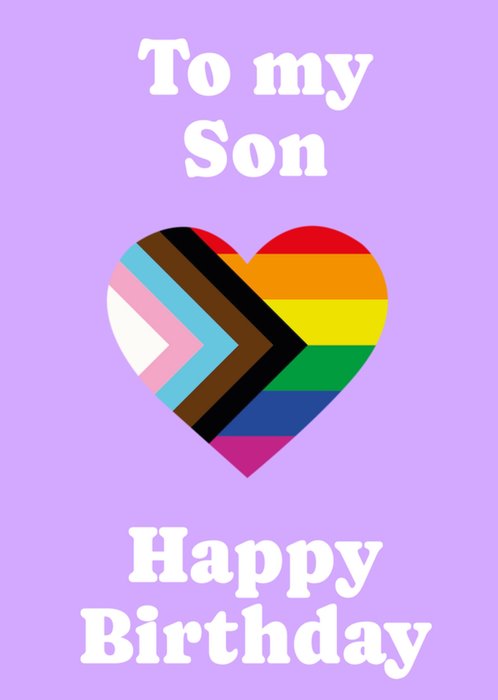 A loving and inclusive birthday card featuring a heart in the colours of the Progress Pride flag, set against a soft lilac background. With bold white text expressing birthday wishes specifically for a son, this design proudly celebrates LGBTQ+ identity and family support.