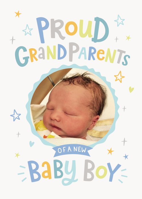Featuring playful pastel lettering reading “Proud Grandparents” and “Baby Boy” curving around one large circular photo upload frame with a scalloped blue border, surrounded by small doodled stars, hearts and lines in blue, yellow and grey on a clean white background.