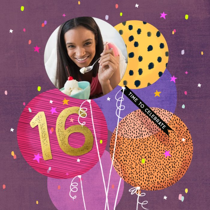 Front of card: Illustrated balloons on purple confetti background with photo frame in one balloon and big age in another balloon Text reads: "16 Time to Celebrate" WIth editable photo. Back of card: Colette Barker logo. Moonpig logo.
