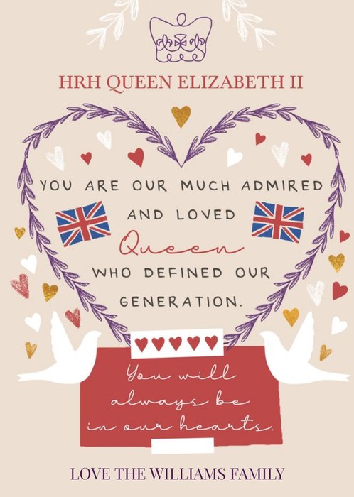 Text reads: "HRH Queen Elizabeth II you are our much admired and loved Queen who defined our generation you will always be in our hearts Love the williams family.