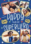 Front of card: Featuring five photo upload areas in colourful frames surrounded by playful handwritten text and multi-coloured stars. Text reads: "Daddy you're my superhero. Bang! Pow!"