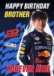 This energetic greeting card features Red Bull Racing driver Yuki Tsunoda in full gear, with bold text that reads "Happy Birthday Brother" and "Forever Rebl", set against a dynamic blue patterned background featuring racing elements and the car number 22.