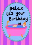 Featuring a bright and colourful design of a lady in a pink bath tub with a black cat peeking over the edge. The design is set against a pink and purple striped background.