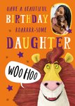 Front of card: Featuring a stylised illustration of a lion's face and mane, the lion is saying 'woohoo!' Text reads: "Have a beautiful Birthday roarrrr-some daughter."