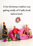 Featuring a picture of 2 dolls sitting on a sofa holding bottles of wine, getting drunk, with Christmas decorations in the background.