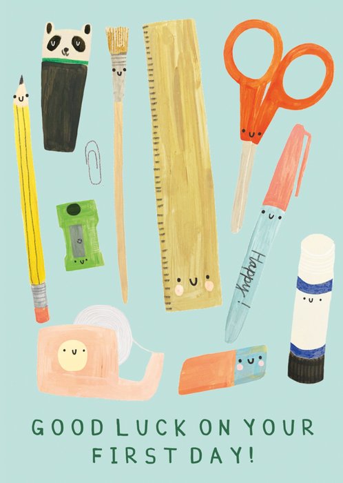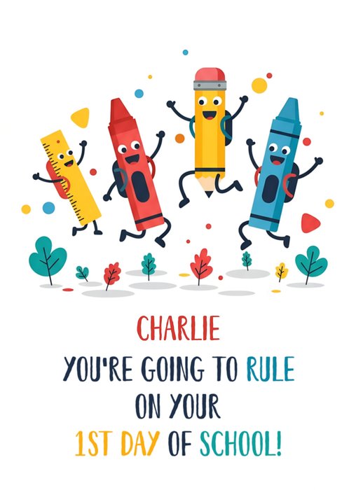 A colourful design featuring smiling, cartoon stationery leaping in celebration. The characters are surrounded by colourful leaves, and there is an empowering message with an editable name.