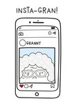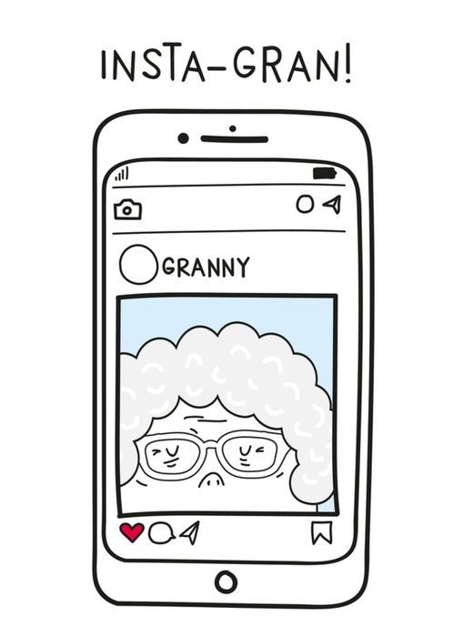 This greeting card design features a humorous “Insta-Gran!” theme, showcasing a cartoon-style illustration of a smartphone displaying a playful social media post of a granny, complete with glasses and a fluffy white hairstyle, on a light blue background.